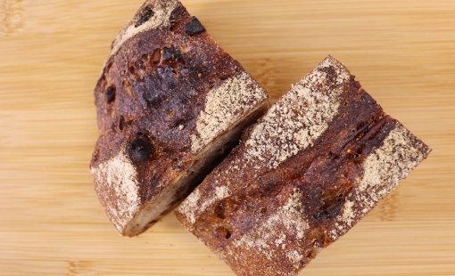 カカオとチョコレート、ミルク、蜂蜜入りの甘やかな生地と、オートミールを外側に。見た目の割には素朴で、朝食やおやつをテーマにしたパン。柑橘系のジャムとの相性もGoodです。ミルクやコーヒーと。